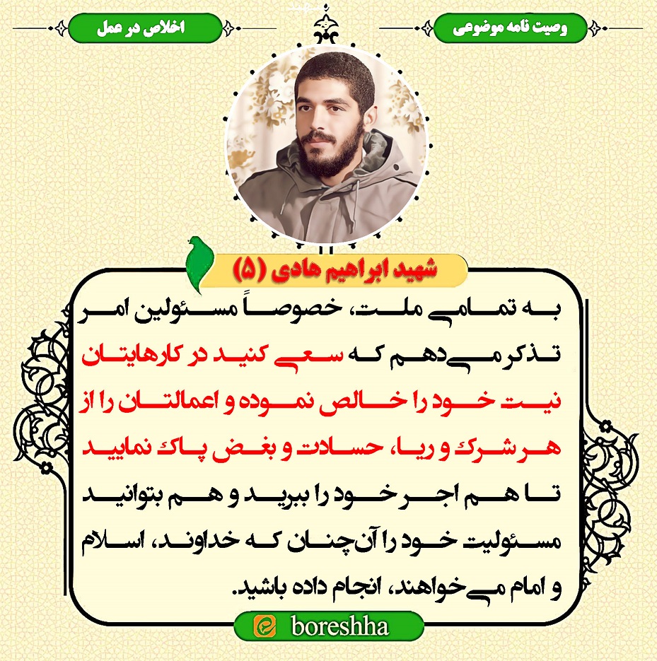 - اخلاص در عمل در وصیت نامه شهید ابراهیم هادی