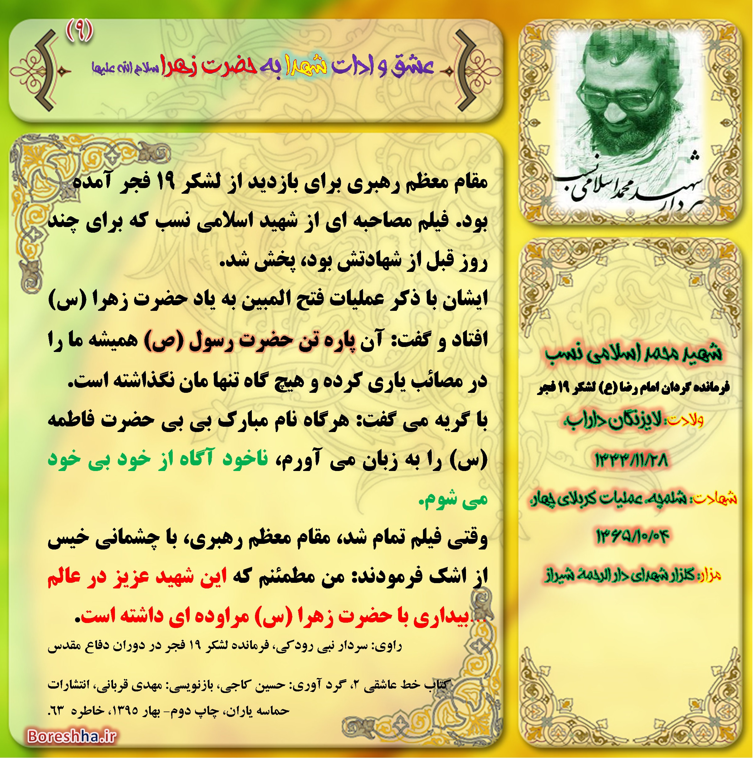 مقام معظم رهبری برای بازدید از لشکر ۱۹ فجر آمده بود. فیلم مصاحبه ای از شهید اسلامی نسب که برای چند روز قبل از شهادتش بود، پخش شد.